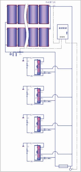 2、太陽能主循環系統控制與每戶控制分離,用戶通過戶內控制面板及連接在管道上的閥門操作,將集熱器收集的熱量平均傳遞給每戶獨立的水箱,并且通過邏輯設定實現每戶熱量平均分配。