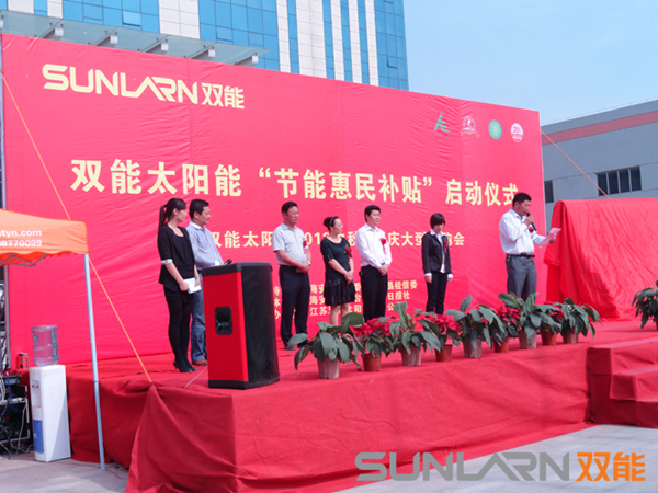 海安縣發改委副主任康健先生與發改委資源節約和環境保護科科長景月蘭女士出席活動。海安電視臺、海安日報等媒體進行采訪報道。康主任代表海安政府、發改委、工信委發表講話。他對雙能成功中標國家“節能產品惠民工程”表示熱烈祝賀,對雙能強烈的企業使命感給予極高評價,并表示海安政府會大力支持雙能這樣的企業,同時預祝雙能太陽能此次活動取得圓滿成功。