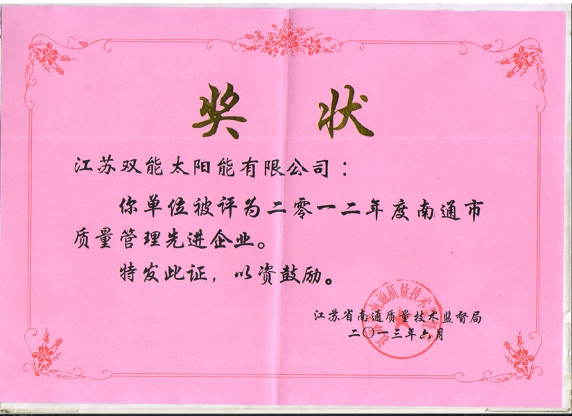 日前,江蘇雙能太陽能有限公司被評為“南通市質量管理先進企業”。