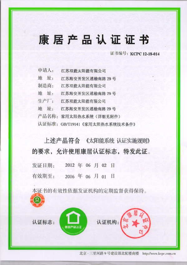 11月5日,雙能太陽能收到了由北京康居認證中心寄來的康居產品認證新證書。這表明雙能太陽能在獲得康居產品認證證書的時期內,保持著高效、節(jié)能的產品特點。雙能全玻璃真空管緊湊式太陽能、全玻璃真空管分體式太陽能及平板分體式太陽能均通過定期監(jiān)督。