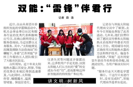 2014年3月12日,《北票市報》刊登了雙能太陽能學雷鋒活動《雙能:“雷鋒”伴君行》。報道了雙能太陽能北票代理商3月雷鋒月服務市民的學雷鋒行動,通過印刷惠民宣傳單和科普資料以及現(xiàn)場設立服務咨詢站等方式,為北票市民普及太陽能熱水系統(tǒng)知識、排除太陽能常見故障。